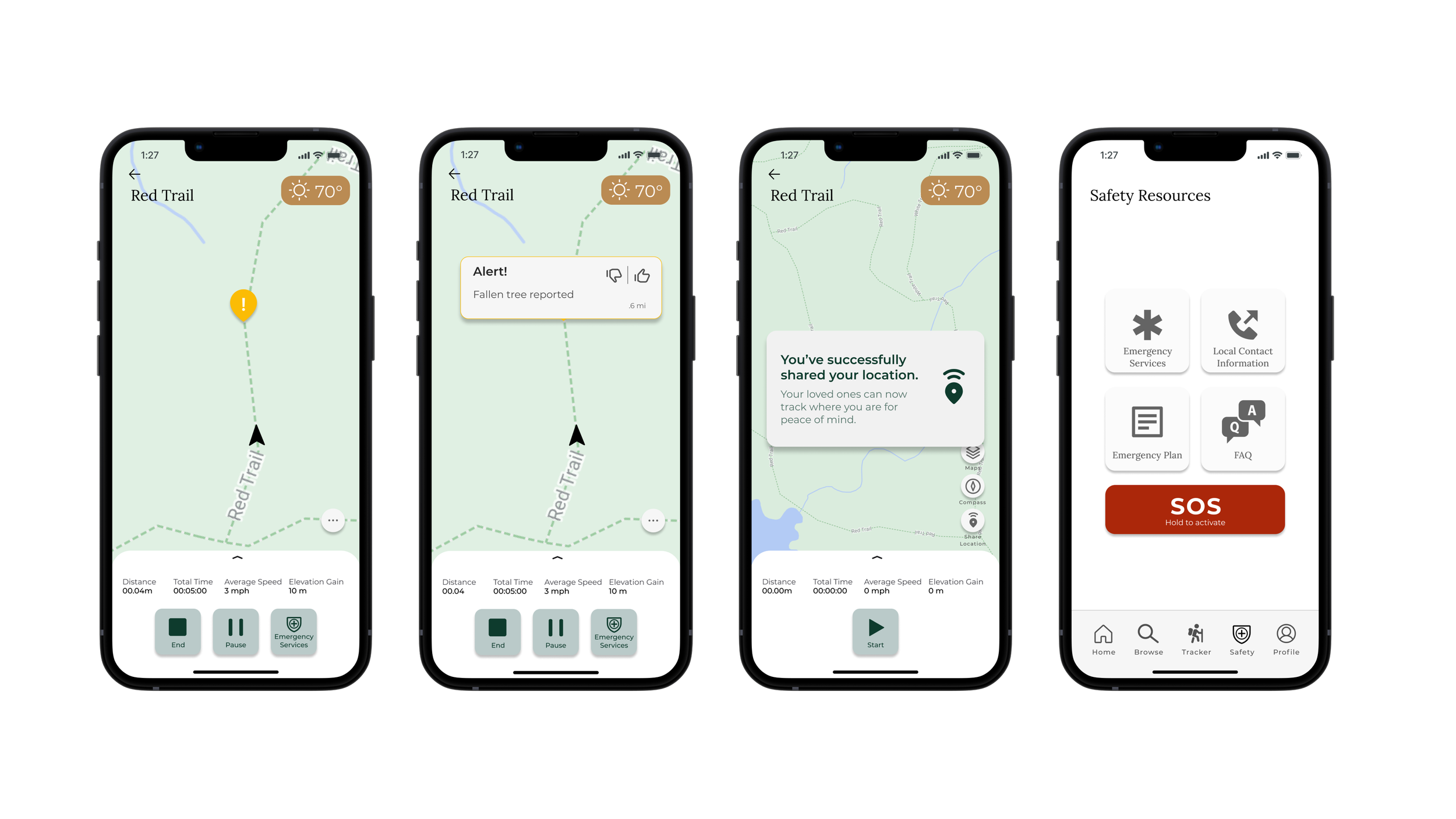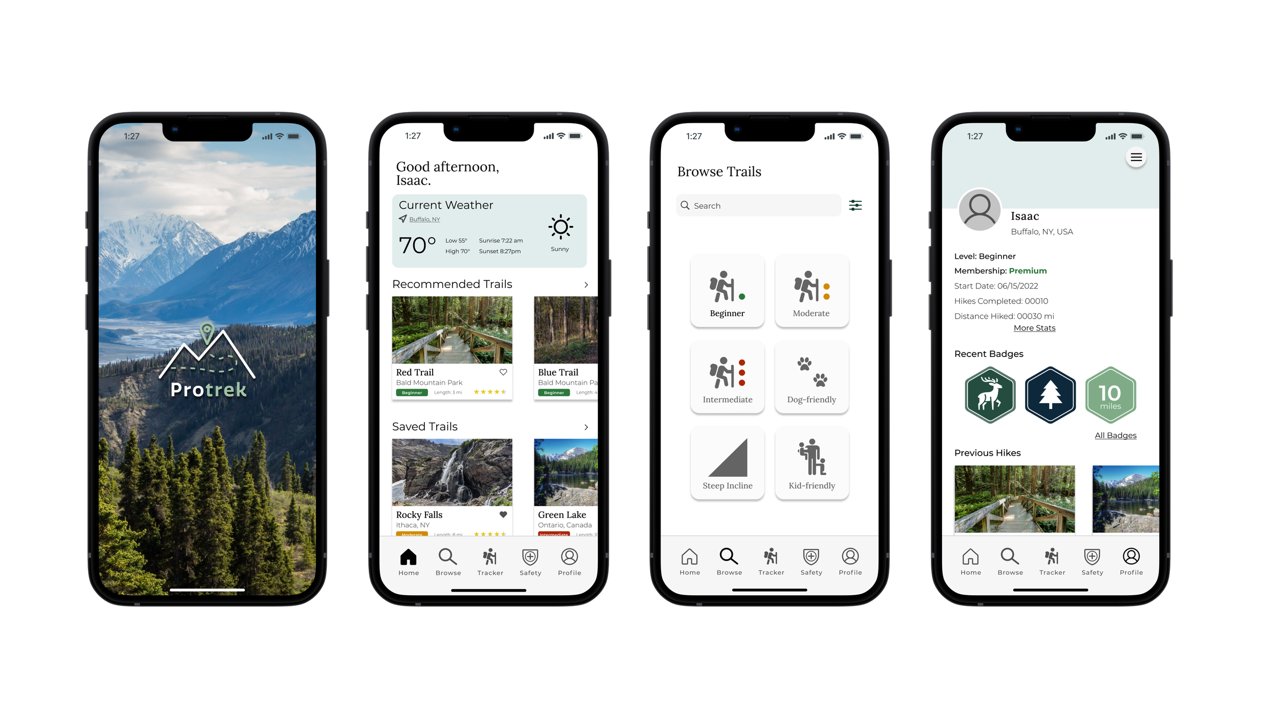Protrek is a hiking app designed with the safety of the user in mind. Our team noticed a gap in safety-based hiking apps. We did extensive research before starting the design, including surveys and interviews, user-journey maps, card sorting, and flowcharts. Our goal was to create an app that provides valuable information and resources for the hiker and keeps them safe on their travels.
